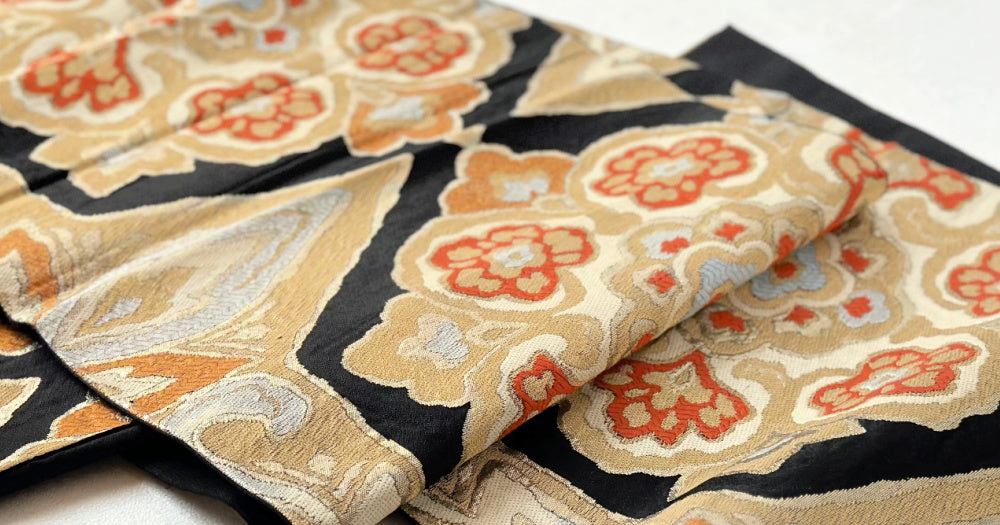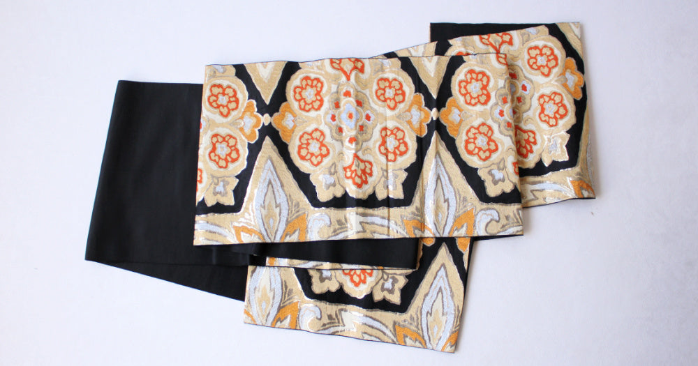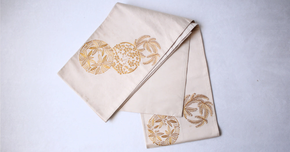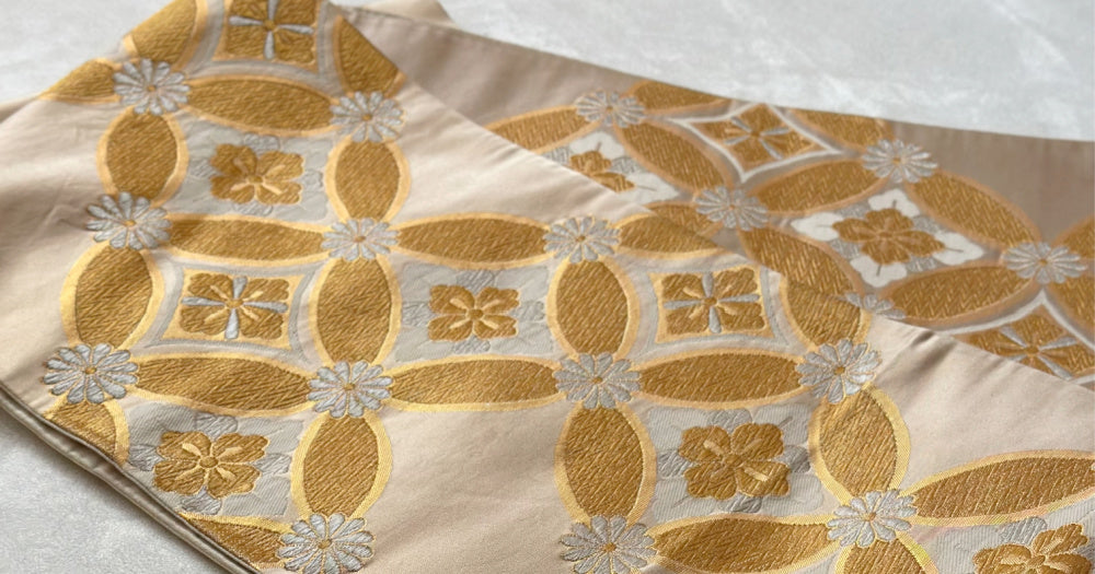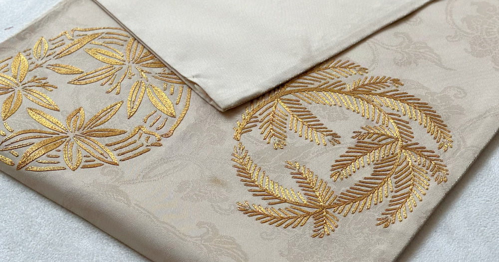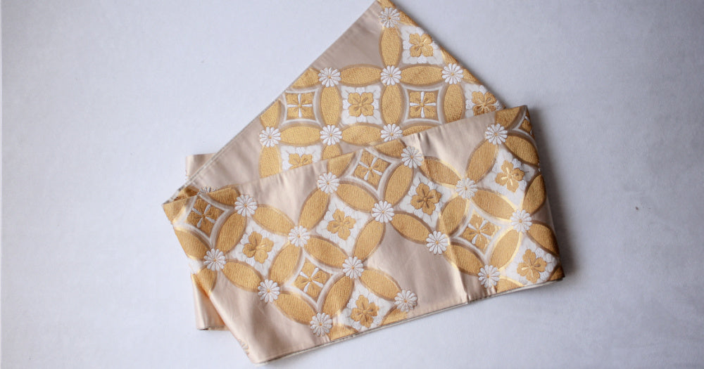 From far, this look like a plain white obi belt with golden embroidery of floral motifs. Up close, you can however see that the white fabric is filled with beautiful woven patterns, known as "jimon"(地紋), for texture and aesthetics.