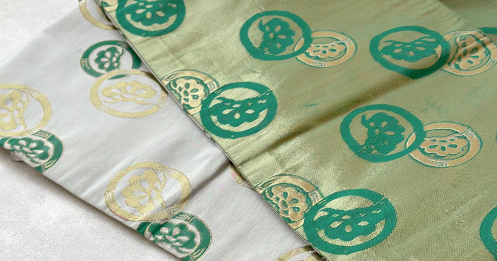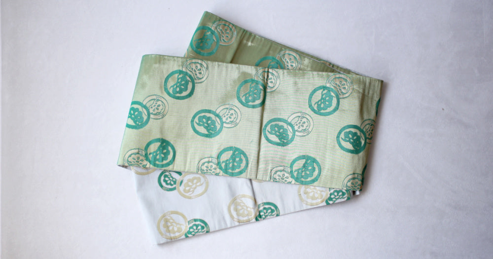 This is a reversible obi belt filled with pine tree emblems. Known as "matsu", pine trees are iconic symbols that represent endurance, longevity, festivity and celebration, and eternal youth. You can choose to have your Ojami made entirely with the green or white side of the obi belt or mix the two colors up to create a duo-tone Ojami.