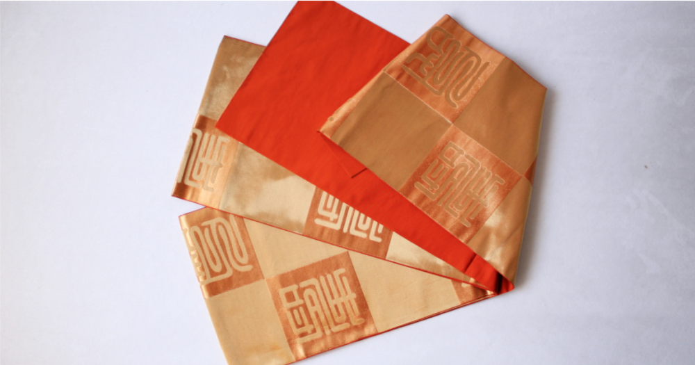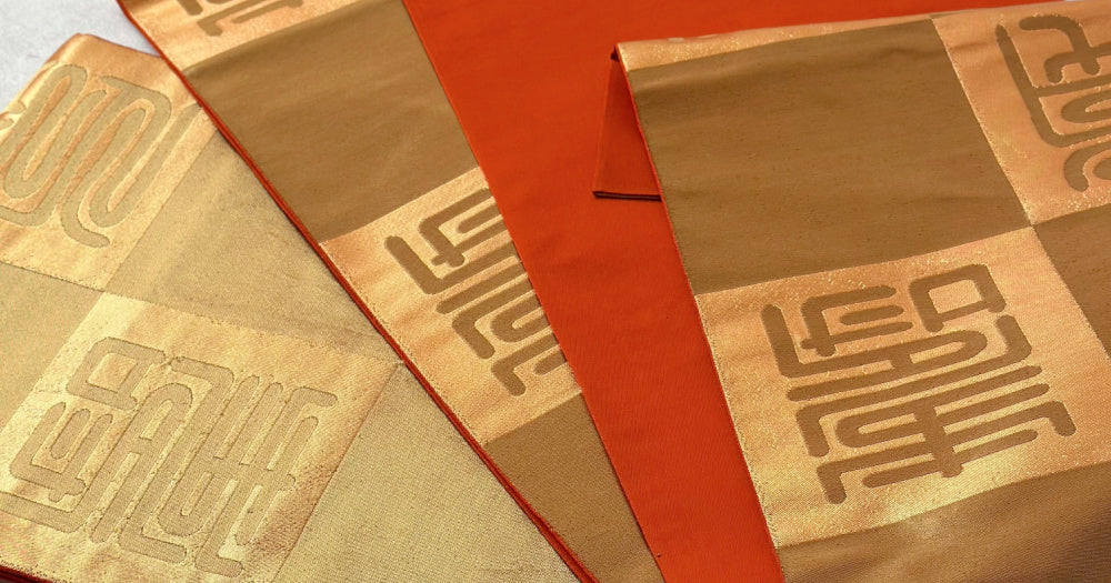Featuring royalty colors of orange and gold, the Kanji on the front of the obi is the word "寿", which means longevity. In Japan, orange symbolizes love and happiness and in ancient times, the color was exclusive to the Crown Prince as it is a sign of prestige and status.