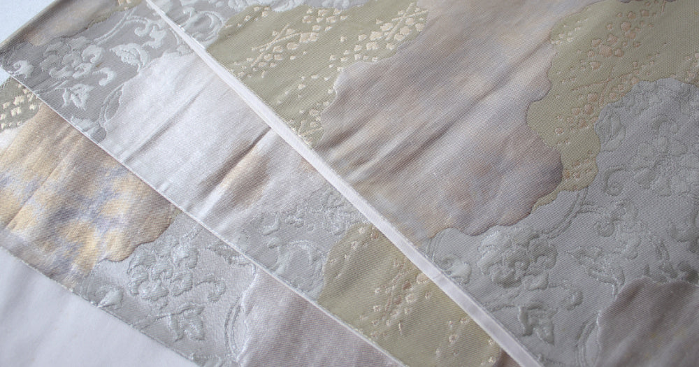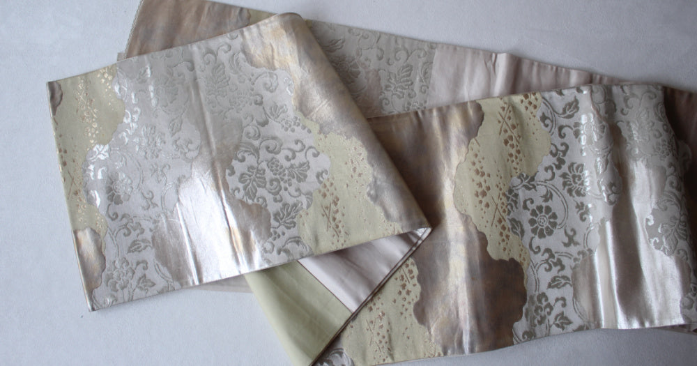 This vintage obi's color palette is composed of soft, muted shades of silver, gold, and beige, creating a harmonious blend that feels both luxurious and serene.
