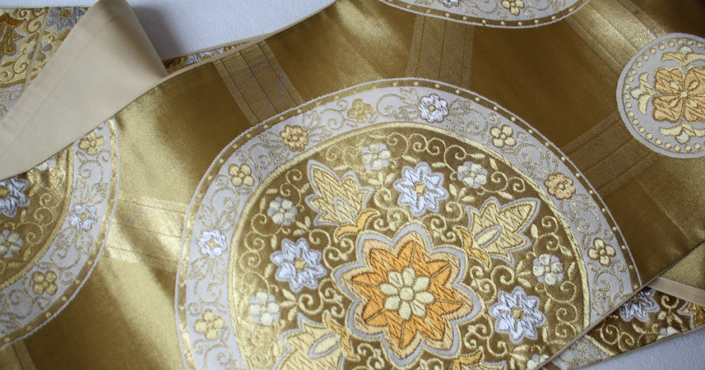 This obi belt is a stunning example of traditional Japanese textile art, featuring intricate circular floral medallions set against a luxurious golden background. The medallions showcase detailed floral motifs, likely chrysanthemums or peonies, which symbolize longevity, nobility, and prosperity