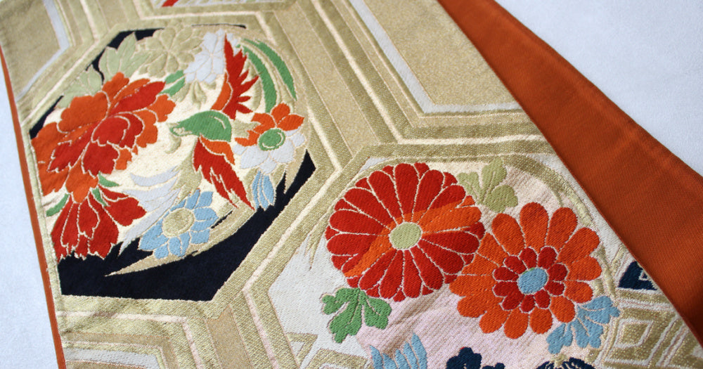 This vintage obi belt features a stunning combination of bold floral motifs, including apricot blossoms and peonies, framed within geometric hexagons on a luxurious golden background.