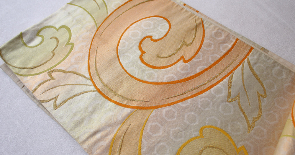 This vintage obi belt features a graceful and flowing design characterized by large, swirling arabesque patterns, known as Karakusa, in soft, warm tones. The prominent scrolls and leaf motifs, rendered in shades of orange, gold, and pale green, elegantly curve across the fabric, creating a sense of movement and fluidity. The Karakusa are set against a background made up of traditional patterns like Seika waves and Kikko tortoise shells that adds a delicate texture without overpowering the main motifs.