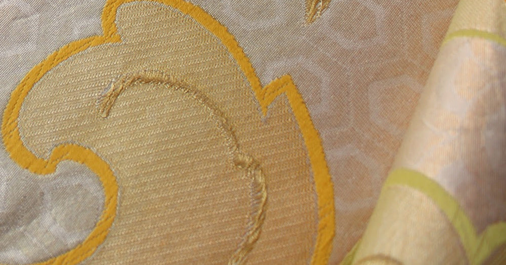 The gold base color, often associated with wealth and celebration, is complemented by subtle accents of white, cream, and hints of orange, creating a harmonious and radiant effect. Crafted using elaborate weaving technique, the obi combines smooth textures with raised, shimmering details that catch the light beautifully. The intricate patterns and use of metallic threads highlight the exquisite craftsmanship, making this obi a work of art rich in cultural significance.