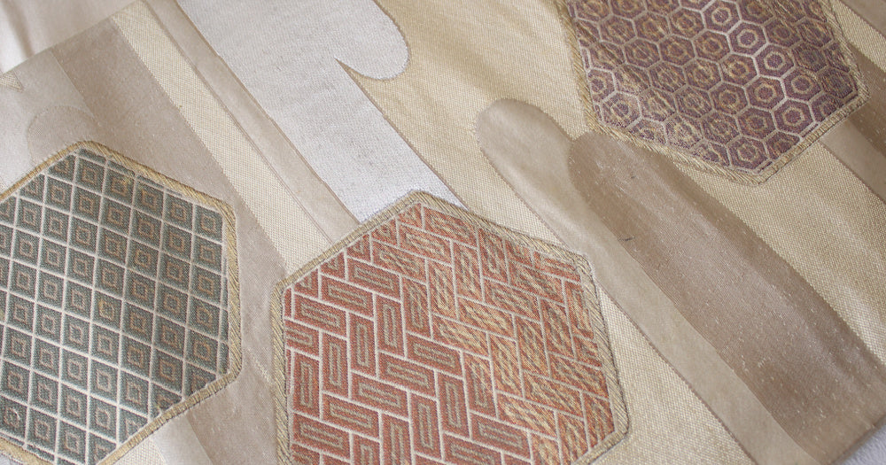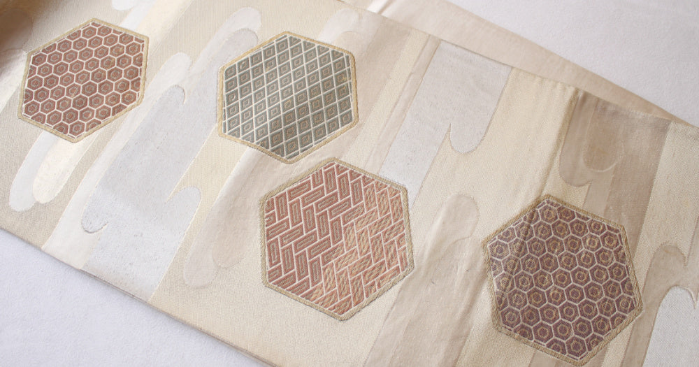 Adorned with 亀甲文様 (Kikkō Mon’yō) – hexagons representing tortoise shell, and 雲 (kumo) – flowing clouds, on a muted silver, gold and cream background, this vintage obi belt exudes refined and understated beauty and elegance.