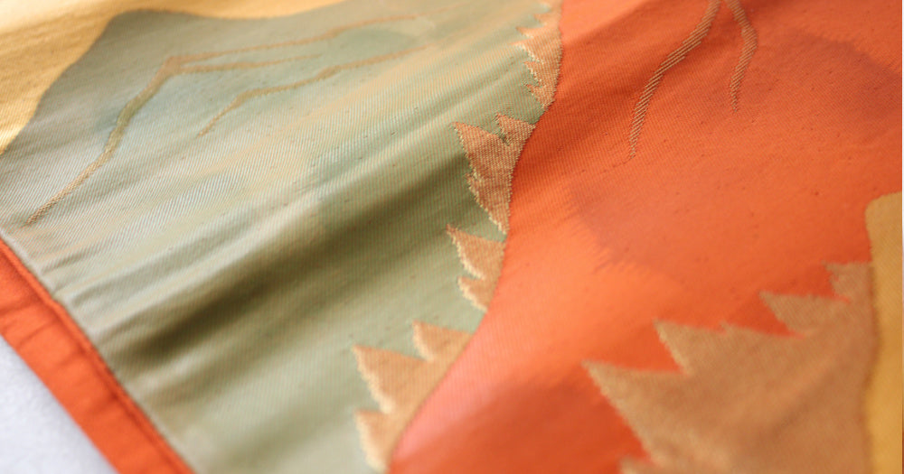 The appeal of this obi lies in its vivid depiction of a mountain landscape, glowing in the warm, vibrant hues of a sunset. The trees on the mountain are rendered in shades of gold, creating a visually stunning and captivating scene.