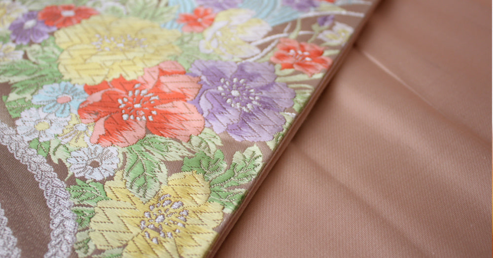 Feminine and elegant, this champagne pink obi belt features a harmonized multi-colored floral arrangements of iris, peonies, chrysanthemums and wisteria.