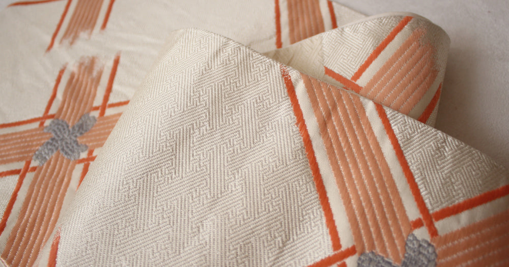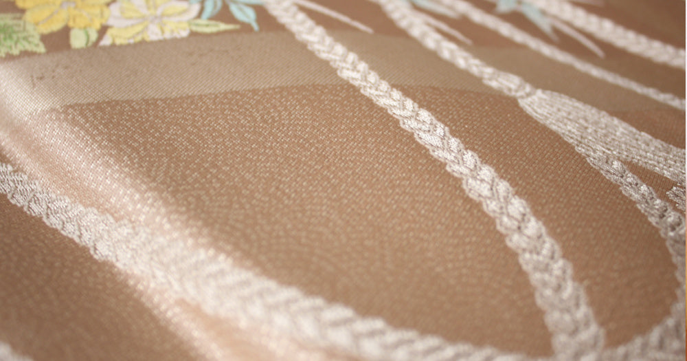 If you look closely, the white background of the obi is filled with woven Sayagata pattern (紗綾形), made up of interlocking 卍 (manji), an ancient buddhist symbol. The Sayagata pattern symbolizes an unending line of descendants and good fortune of the family.