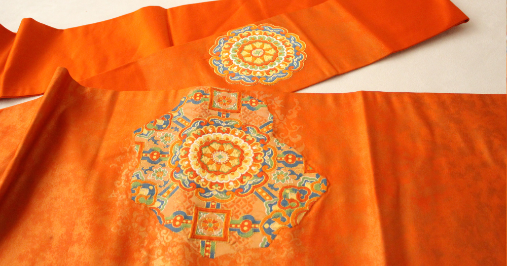 This obi belt radiates warmth and opulence with its striking vermilion-orange hue, a color often associated with vitality, joy, and protection in Japanese culture.