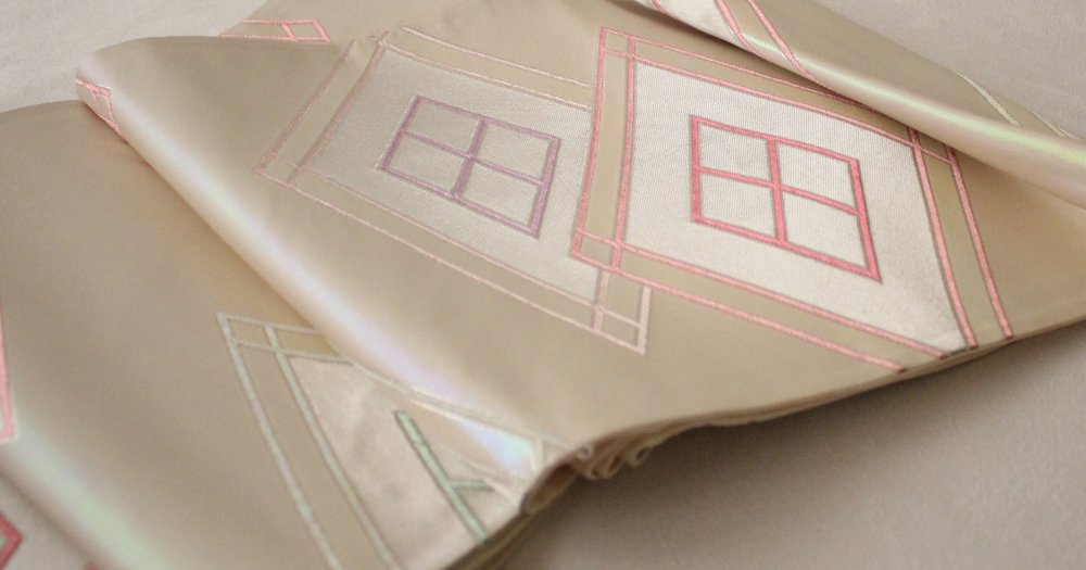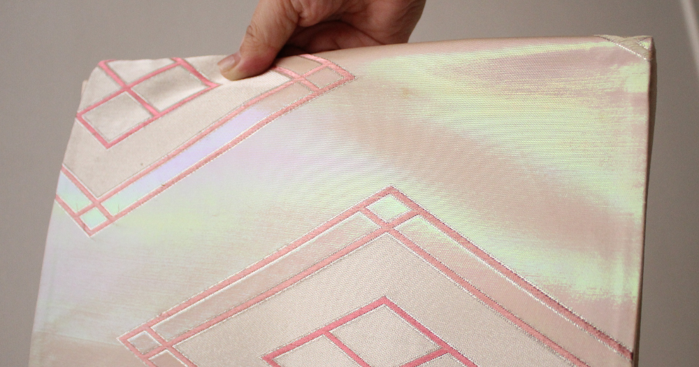The Hishi (菱) diamond patterns, meticulously embroidered with threads featuring a delicate color gradation resembling the hues of a rainbow, add depth and elegance to its design. From different angles, the obi reveals subtle shifts in tone, creating an ever-changing visual experience that enhances its refined charm.