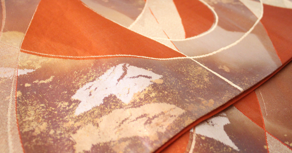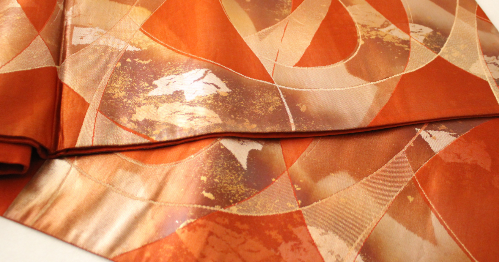 Featuring an elegant interplay of curved lines that is reminiscent of flowing water or wind-blown sand dunes, warm hues of gold, rusty orange and earthy browns representing sophistication and refined luxury – this obi belt is a mesmerizing work of art.