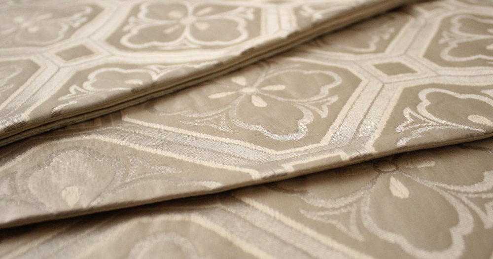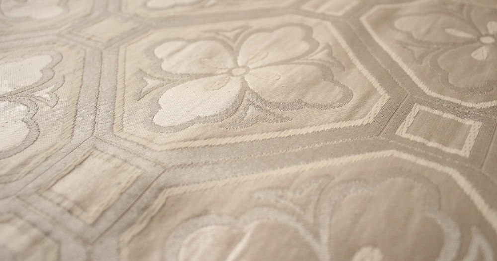 Simple and emanating quiet luxury, the beauty of this vintage obi lies in its iridescent beige and silver background, which shimmers with a hypnotic play of colors as light dances across its surface.