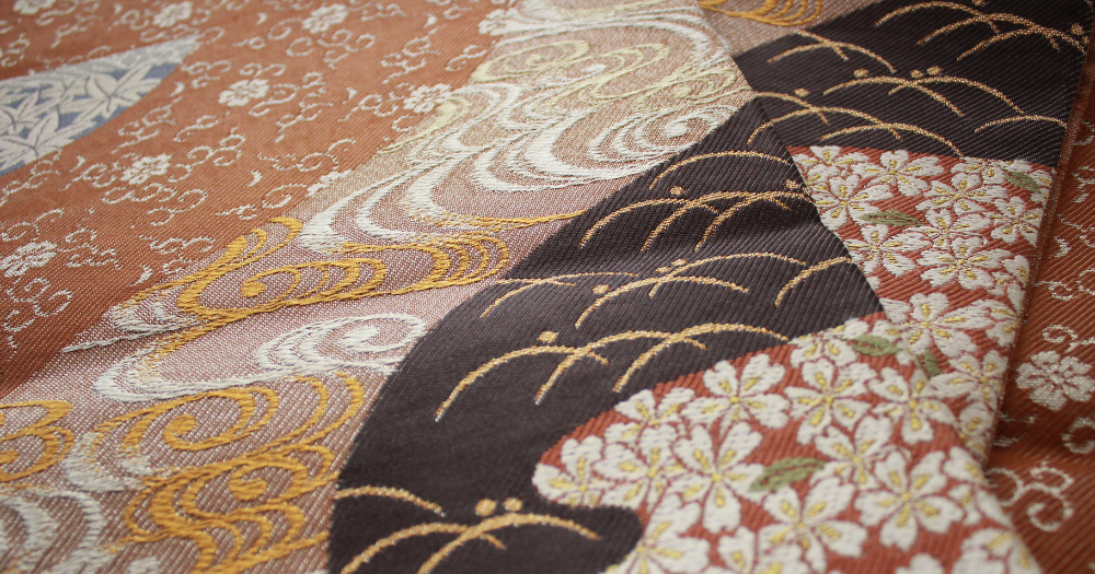A flowing river runs through the center of this obi belt, symbolizing the purification and cleansing of misfortune through ever-moving water. This auspicious motif is believed to bring good luck and is known as 流水文様 (Ryusui Monyo), the "flowing water" pattern.