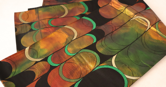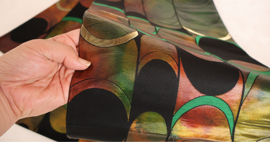 This obi presents a bold, contemporary vision, where overlapping circular and oval motifs—outlined in green, gold, and black—create a rhythmic and dynamic composition. Deep hues of amber, burnt orange, moss green, and dark brown flow together in rich, painterly gradations, lending the fabric a remarkable sense of depth and movement. Its subtle luster and elegant design marry modern sophistication with traditional craftsmanship. A true artistic statement, this obi bridges timeless artistry and abstract, contemporary design.