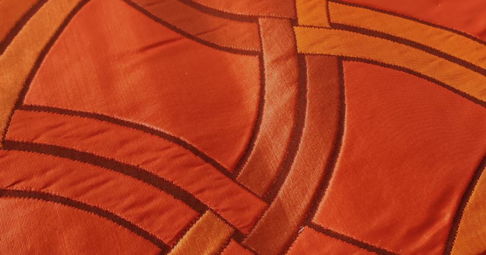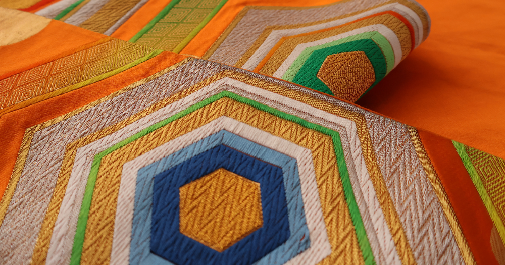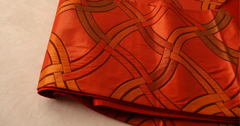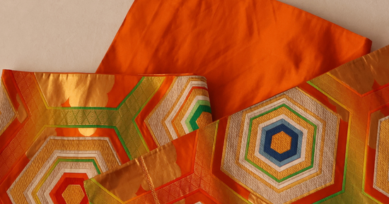 This obi features a refined geometric design in vivid shades of red and orange. Interlocking curved bands form a rhythmic lattice motif, creating a sense of movement and balance. Subtle gradations—from bright vermilion to deep amber and muted gold—add depth and warmth, while the gentle sheen of the fabric enhances its richness.