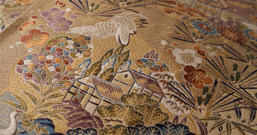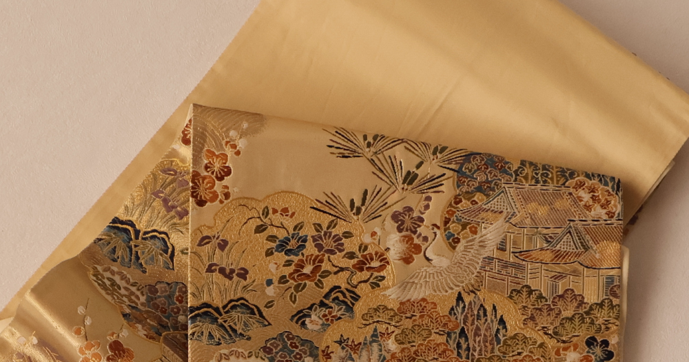 Elegant and exquisite, this gold-hued obi blends architectural motifs with elements of nature—mountains, pine trees, and cranes—to evoke specific scenes and the ever-changing beauty of Japan’s four seasons. Accents inspired by natural colors beautifully complement the golden base.