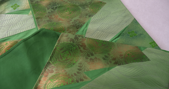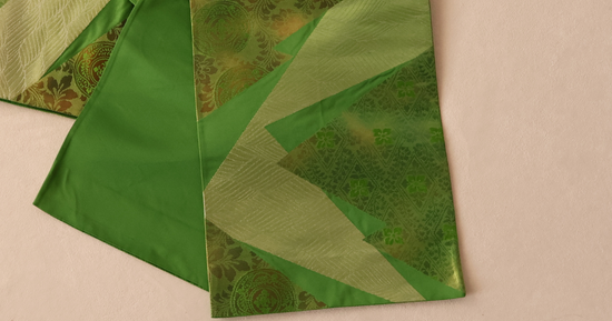 This rare green obi exudes elegance and sophistication. Its surface is adorned with Hana-bishi (花菱), a diamond-shaped motif of four-petaled flowers rendered in gold, symbolizing beauty and vitality. Flowing alongside are delicate white waves, a classic auspicious pattern representing the continuity of life and the eternal flow of fortune. Woven with meticulous craftsmanship, this obi harmonizes the richness of color, symbolic motifs, and traditional artistry, making it a timeless statement of refinement.