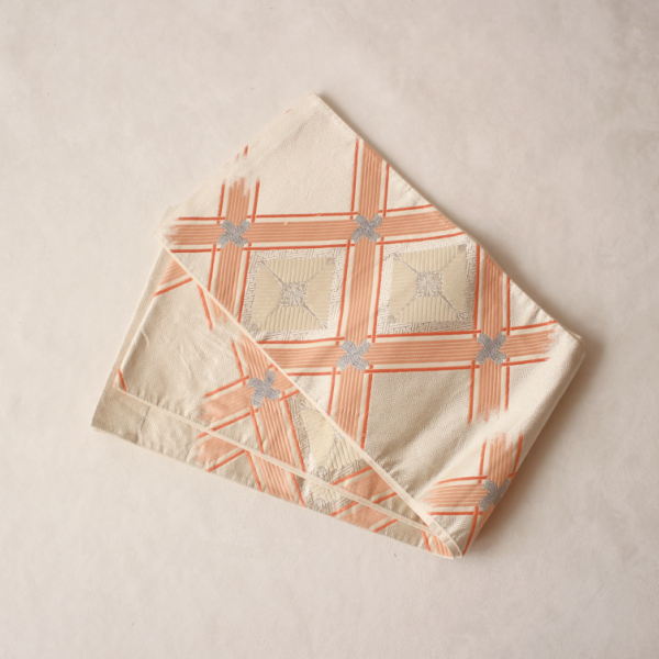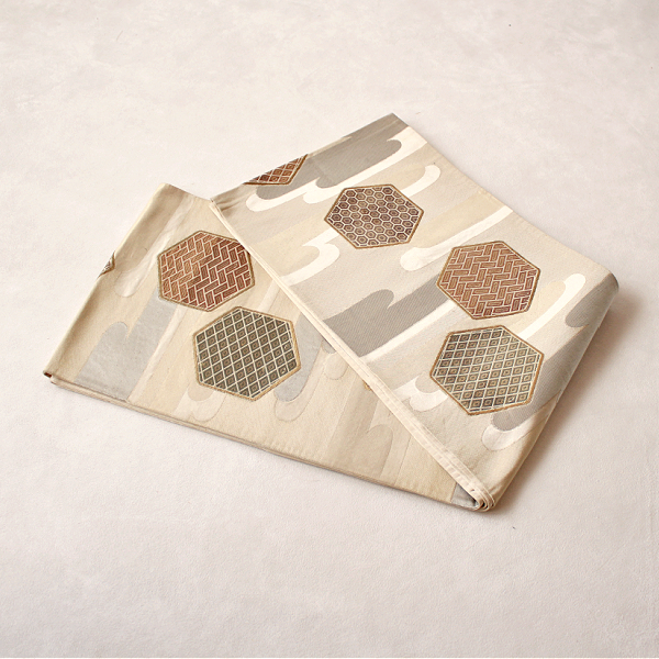 Adorned with 亀甲文様 (Kikkō Mon’yō) – hexagons representing tortoise shell, and 雲 (kumo) – flowing clouds, on a muted silver, gold and cream background, this vintage obi belt exudes refined and understated beauty and elegance.